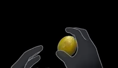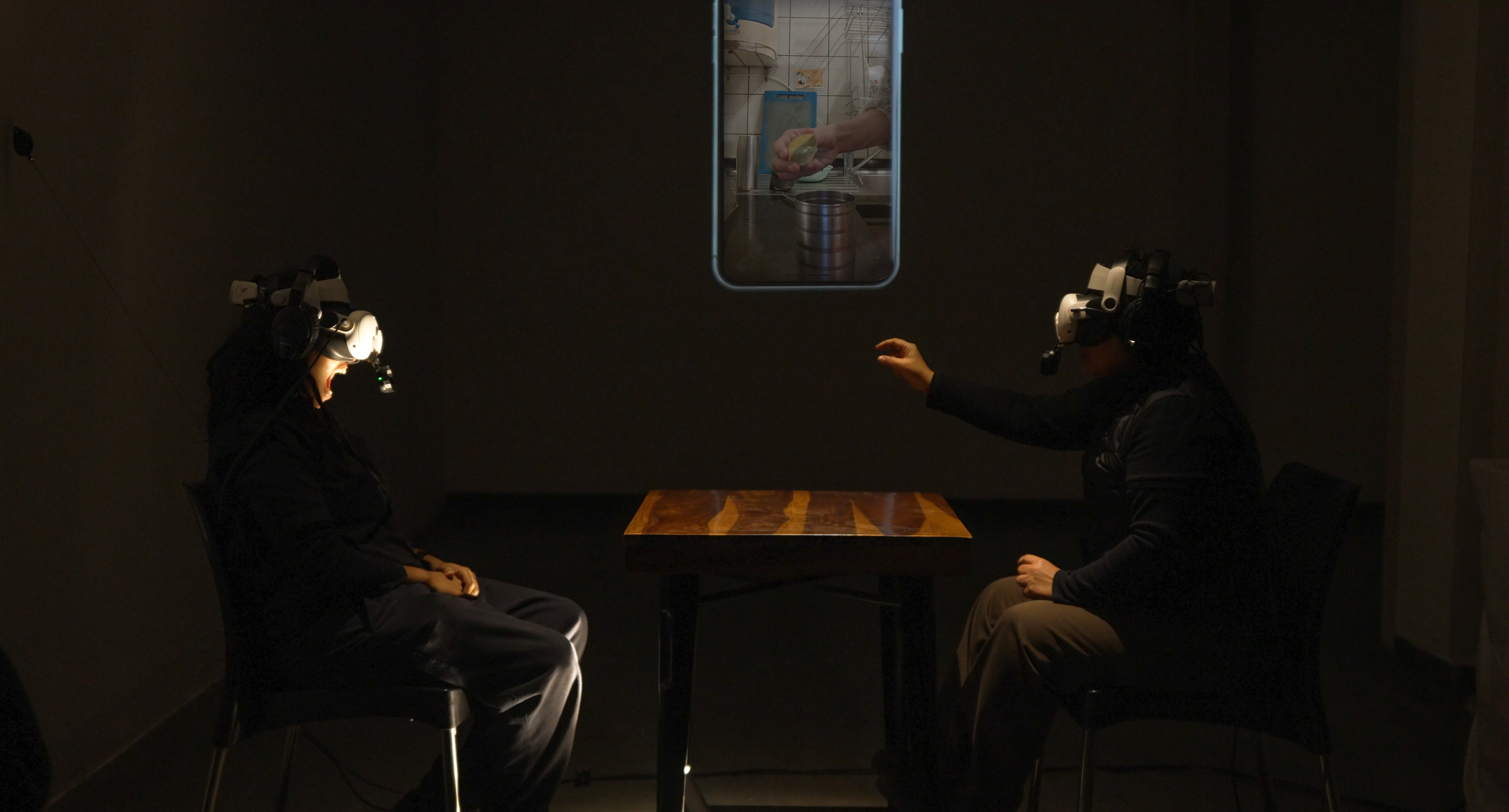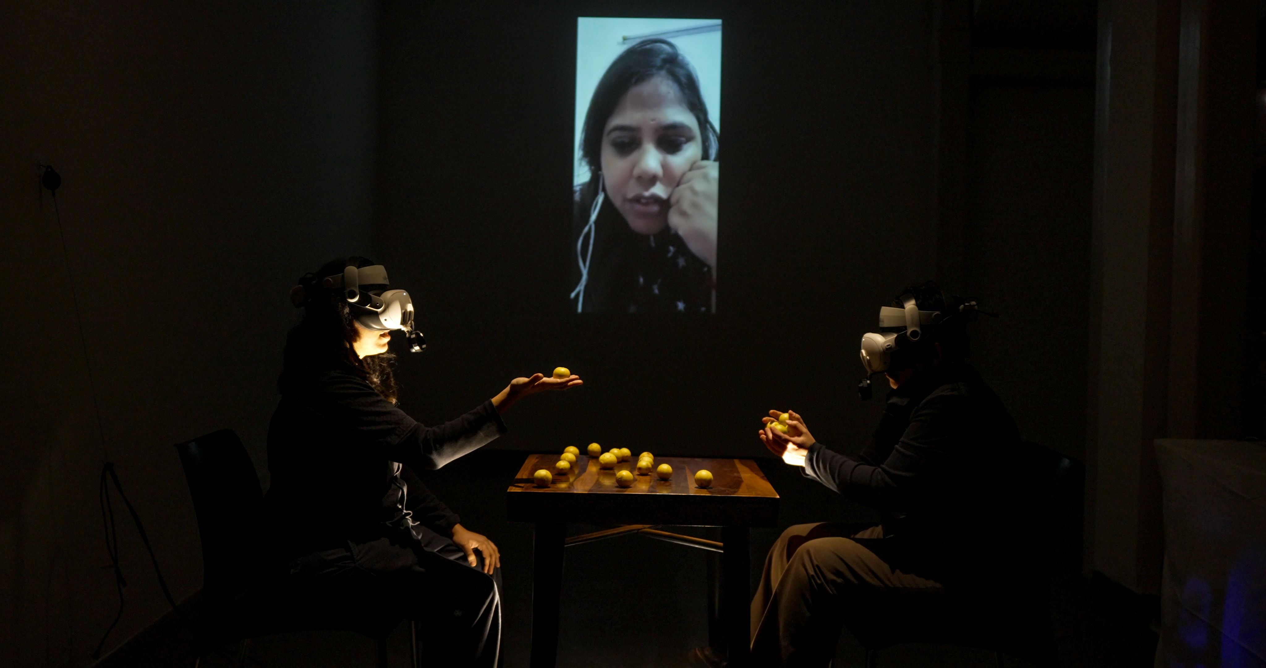 Act Two begins when the curtains reopen, revealing the table now covered with real lemons. Hema reappears on screen, directly addressing the seated audience about her disability. Inside XR, the participants’ interaction also shifts—this time, they pick up tangible, material lemons. The passthrough function (RBG cameras in the XR devices allowing users to see the material world through it) activates mixed reality, allowing them to see each other. Following a series of guided instructions, XR participants engage with the lemons in unexpected ways, eventually extending their actions to the seated audience. As the seated audience members interact with XR participants, Hema appears on the screen singing a Bollywood folk song and the performance reaches its conclusion.