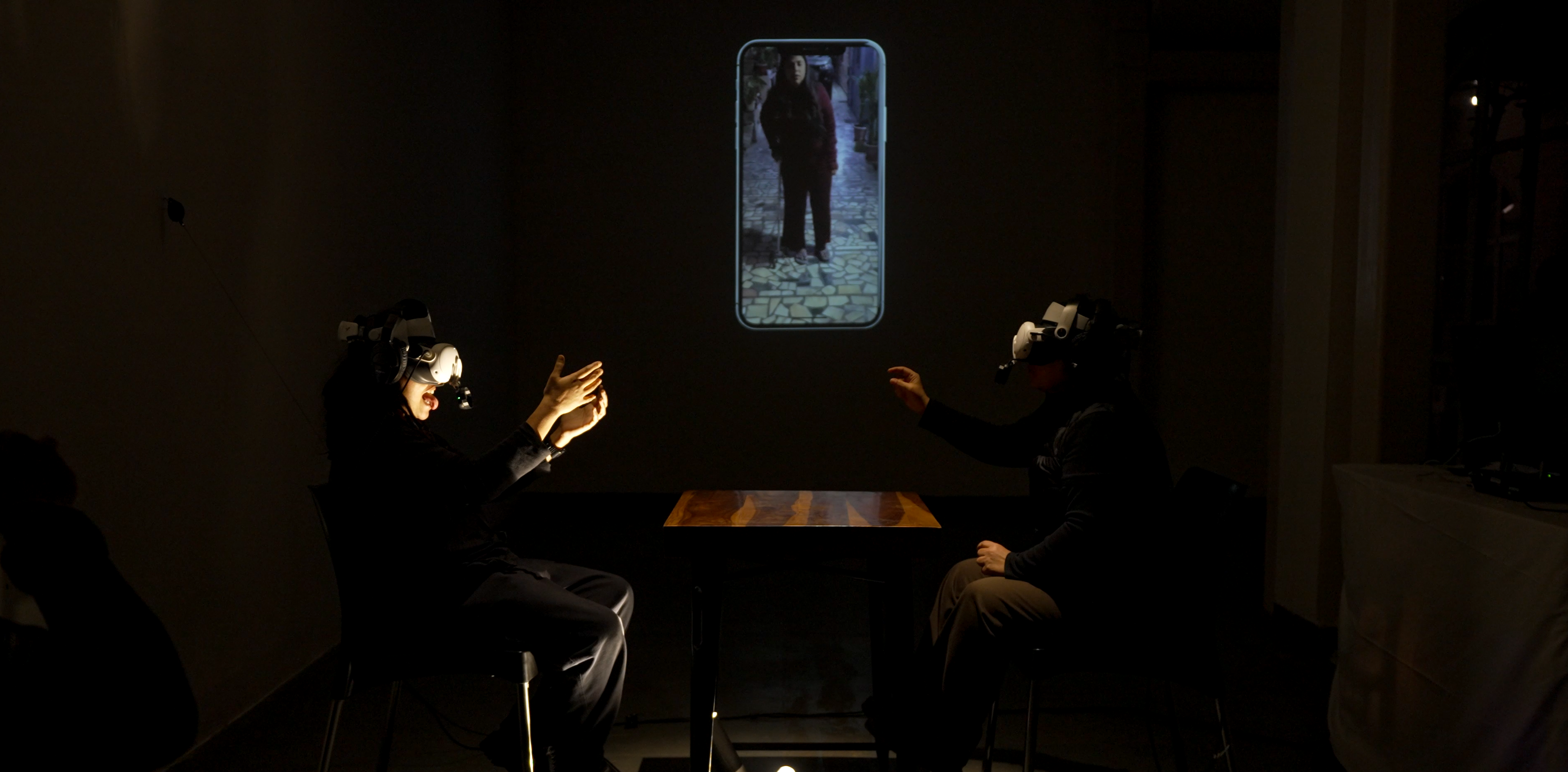The XR performance involves eight persons: two XR participants on stage and six seated audience members who watch a projected documentary about Hema Kumari, an Indian singer living with Rheumatoid Arthritis. The XR users’ partially obscure the film, diverting audience attention through strange mouth and hand movements (instructed to perform in XR), creating a dual-layered experience that disrupts active viewership in Hema’s story and introduces uncertainty. While XR is considered as a hot medium—fully immersive and sensory-dominant—this piece subverts that rationale by repurposing XR to produce absurdity and alienation effect.